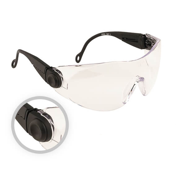 Изключително леки поликарбонатни очила, които се вписват в чертите на лицето, осигурявайки защита на веждите и защита на бузите. Напълно регулируема дължина на рамката.